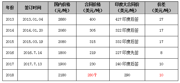 从上表格中,我们看出近五年来,中国签订的大合同与印度均有一定价差,最小价差在2016年,价差在8美金,而2016年亦是印度率先签订的大合同。那不由得我们来大胆猜想一下,中国今年大合同将在什么价位呢。