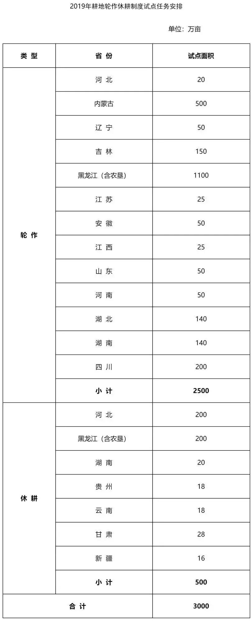 (五)实行精准管理,提升试点水平。对耕地轮作休耕制度试点区域继续实行耕地质量监测,跟踪耕地地力变化。探索运用卫星遥感技术,对耕地轮作休耕制度试点面积落实进行辅助监测。强化监督管理,压实地方各级政府和相关部门责任,提升试点的管理水平。2019年,实施耕地轮作休耕制度试点面积3000万亩。其中,轮作试点面积2500万亩,主要在东北冷凉区、北方农牧交错区、黄淮海地区和长江流域的大豆、花生、油菜产区实施;休耕试点面积500万亩,主要在地下水超采区、重金属污染区、西南石漠化区、西北生态严重退化地区实施。具体任务安排详见附件。1.东北冷凉区和北方农牧交错区。在内蒙古、辽宁、吉林、黑龙江推广“一主多辅”种植模式,以玉米与大豆轮作为主,与杂粮杂豆、薯类、饲草、油料等作物轮作为辅,形成合理的轮作模式,基本改变以玉米为主的连作、重迎茬状况。2.黄淮海地区。在安徽、山东、河南及江苏北部推行玉米改种大豆为主,兼顾花生、油菜等油料作物,增加市场紧缺的大豆、油料供给。在河北推行马铃薯与胡麻、杂粮杂豆等作物轮作,改善土壤理化性状,减轻连作障碍。3.长江流域。在江苏、江西小麦稻谷低质低效区实行稻油、稻菜、稻肥等轮作,改良土壤,提高地力,减少无效供给,增加有效供给。在湖北、湖南、四川大力开发冬闲田扩种油菜(湖南轮作不能在长株潭重金属重度污染区实施),同时在四川推广玉米大豆轮作或间套作,努力增加油菜和大豆供给。1.河北地下水漏斗区。连续多年实施季节性休耕,实行“一季休耕、一季种植”,将需抽水灌溉的冬小麦休耕,只种植雨热同季的玉米、油料、棉花和耐旱耐瘠薄的杂粮杂豆等,减少地下水用量。休耕期间鼓励种植绿肥,减少地表裸露,培肥地力。2.黑龙江寒地井灌稻地下水超采区。重点在黑龙江三江平原地下水明显下降的井灌稻区开展休耕试点。休耕期间深耕深松、鼓励种植苜蓿或油菜等肥田养地作物,提升耕地质量,力争地下水下降势头得到有效遏制,粳稻过剩状况得到改善。3.新疆塔里木河流域地下水超采区。重点在严重缺水、盐渍化严重的南疆塔里木河流域实施,将耗水量大、靠抽取地下水灌溉的冬小麦休耕,减少农事活动,减少地下水抽取,力争地下水超采势头得到有效遏制,满足胡杨林正常生长发育的需求。4.湖南重金属污染区。重点在长株潭重金属污染区实施,在建立防护隔离带、阻控污染源的同时,采取“休、治、培”综合治理模式,通过施用石灰、翻耕、种植绿肥等农艺措施,以及生物移除、土壤重金属钝化等措施,修复治理污染耕地。优先种植生物量高、吸收积累作用强的植物,不得改变耕地性质。5.西南西北生态严重退化地区。重点在贵州、云南、甘肃坡度15°以上、25°以下的生态严重退化地区实施,调整种植结构,改种防风固沙、涵养水分、保护耕作层的植物,同时减少农事活动,促进生态环境改善。中央财政对耕地轮作休耕制度试点给予适当补助。在确保试点面积落实的情况下,试点省可根据实际细化具体补助标准。在操作方式上,可以补现金,可以补实物,也可以购买社会化服务,提高试点的可操作性和实效性。河北、湖南省休耕试点所需资金结合中央财政地下水超采区综合治理和重金属污染耕地综合治理补助资金统筹安排。